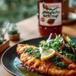 Melt 4 tbsp butter over low heat, add celery and onions and continue to heat until warm. While this is heating cut the skin of the fish in diamond shapes and squeeze lemon juice over the skin and coat liberally with the sticks of butter. Put the bread in a bowl and pour the butter mixture over it and put this into the fish. Now coat the fish with flour, wrap it in foil and bake it for about 45 minutes at 375°F (190.6°C). Spiceitup with Spiceitup! Jalapeno Ketchup!